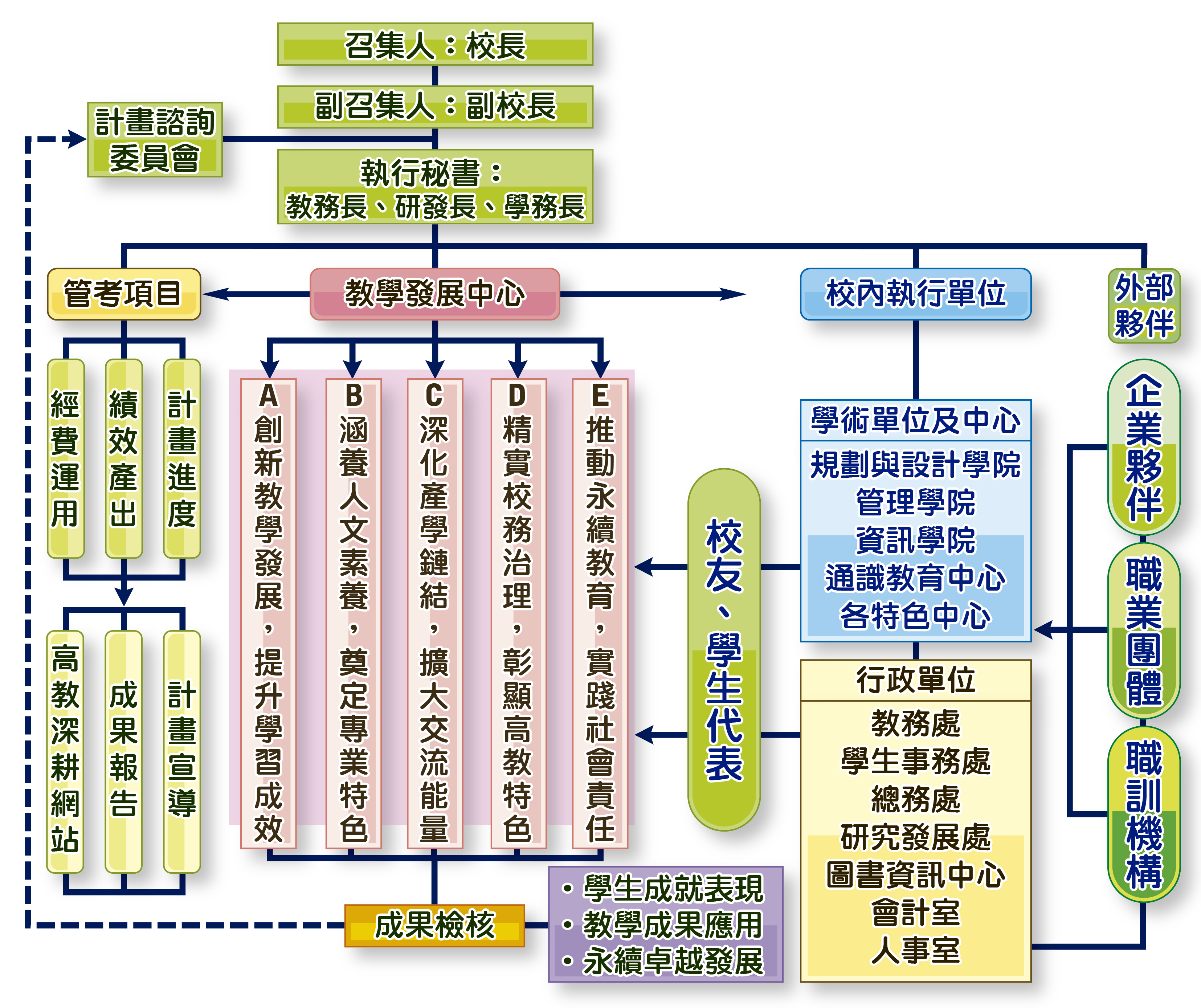 本計畫以校長為召集人並設置諮詢委員會,定期徵詢校外專家意見。此外,並導入外部夥伴機制,包含企業團體、校友等單位以及學生會代表。如下圖: