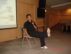 劉政煒理事長現場帶領同學練習「勇骨健身操」,並提醒同學在課程設計中,需由運動前的暖身運動,減少運動傷害,策略上不要去限制老人能做什麼,或不能做什麼,反而應提升誘因引導去從事運動,成功達成積極參與社會活動、避免疾病及失能、維持認知及身體功能三要素。